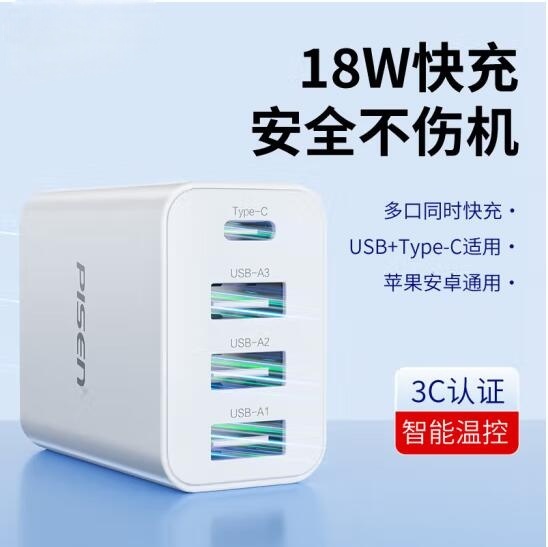 18W充电头3.6A四口USB充电器插头兼容2.4A多口孔快充适用于苹果华为小米三星OPPO安卓手机平板通用装
